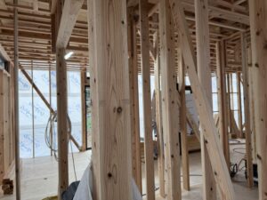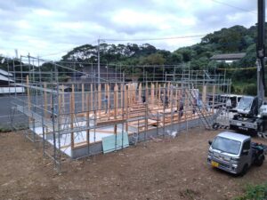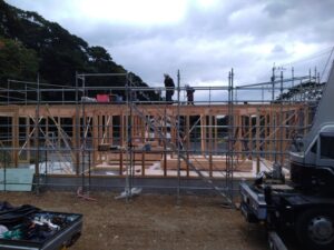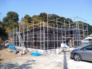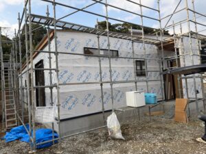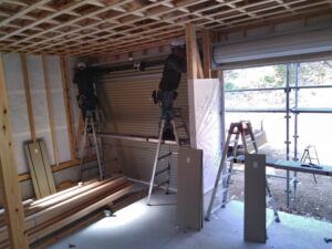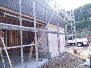 12月8日 外壁が終わり、車庫用シャッターの取付が行われています。